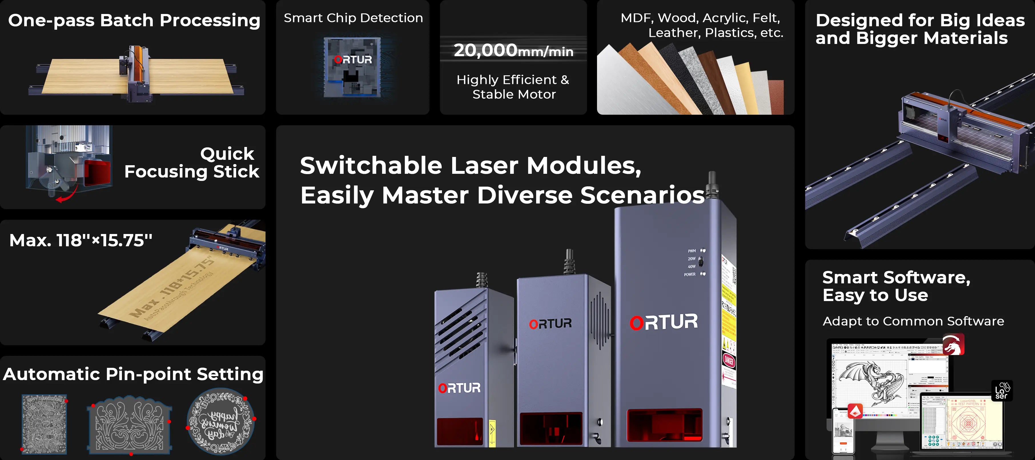 Feed Large Materials, Engrave with Precision, Switchable Laser Modules to Easily Master Diverse Scenario.