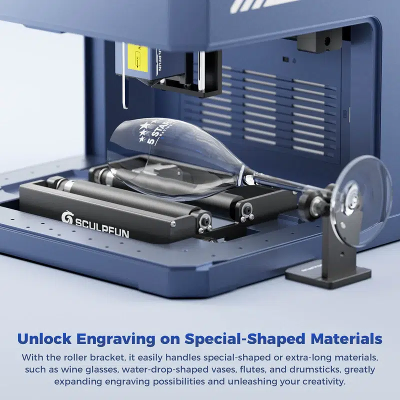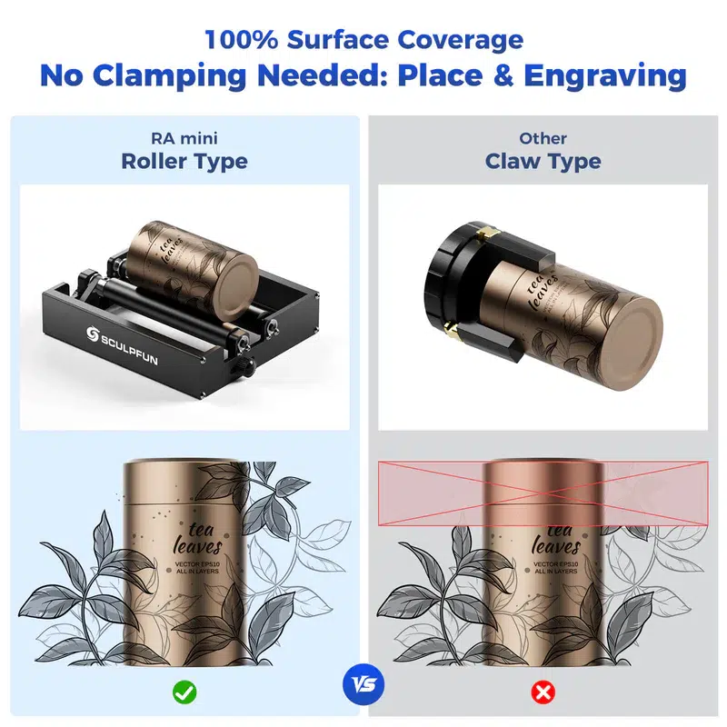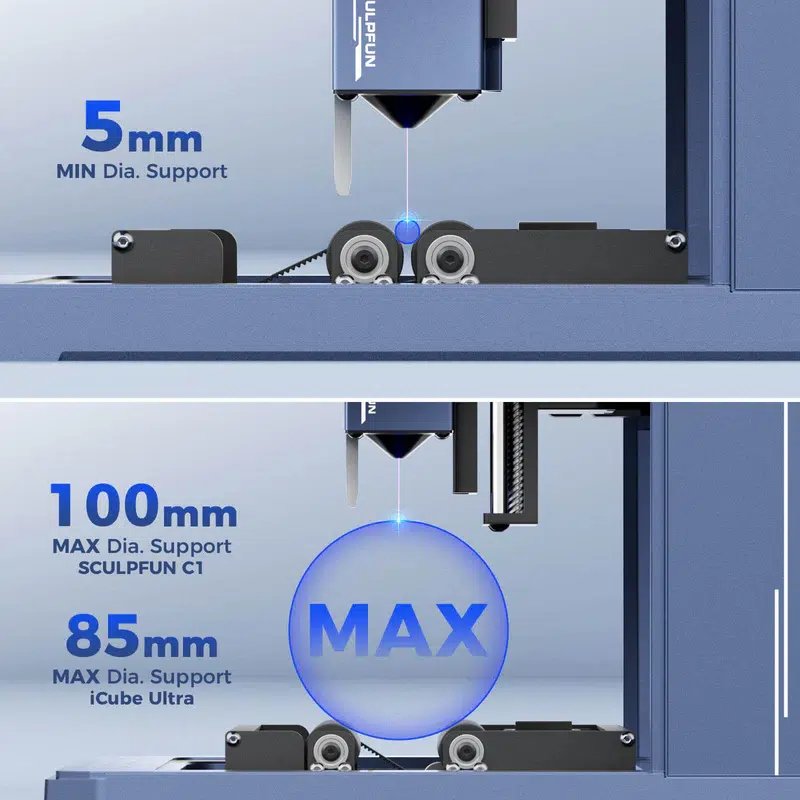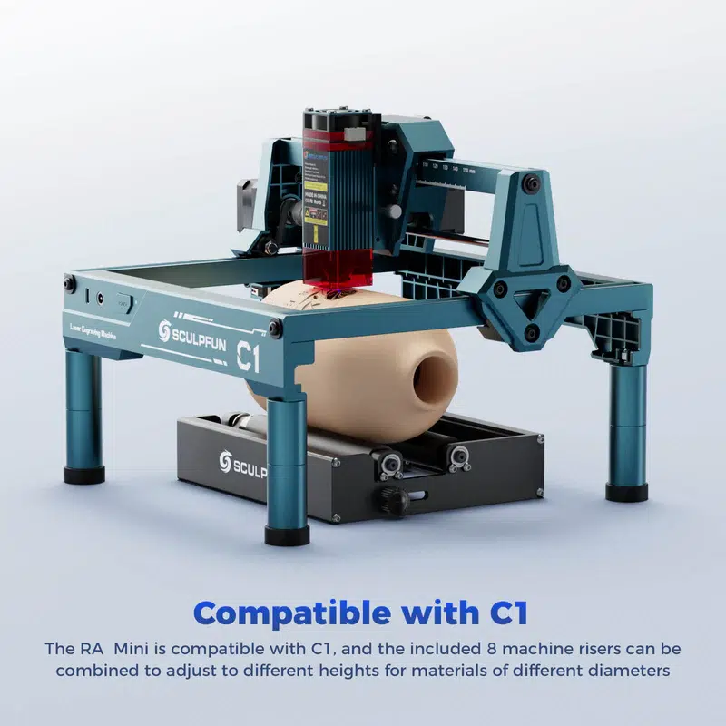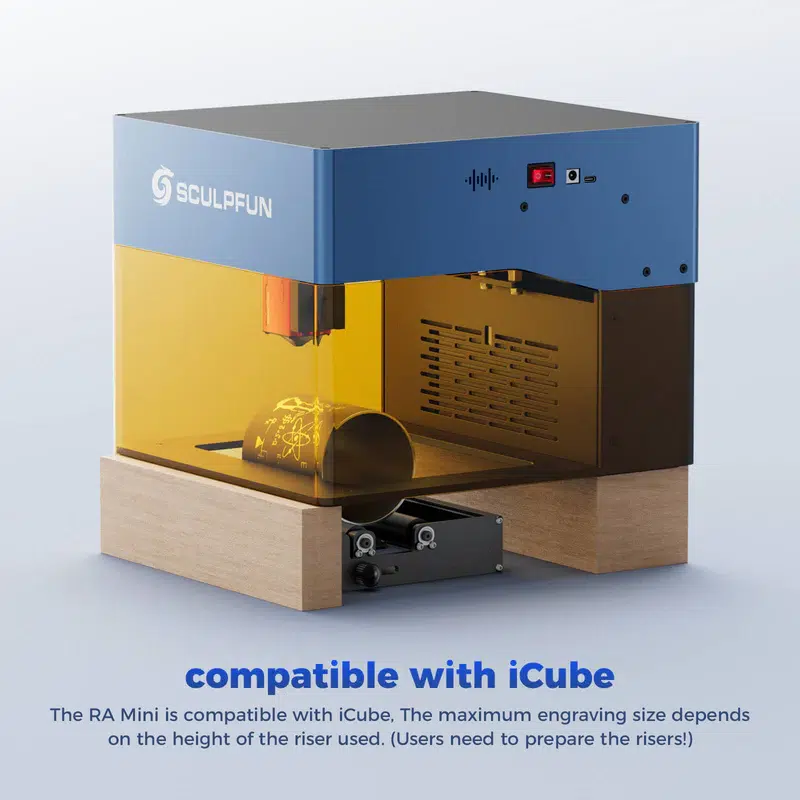 This RA Mini rotary roller is adapted to the Sculpfun iCube Ultra Laser Engravers, C1 mini laser engraver, iCube 3w/5w/10w. With a targeted optimization design, it ensures the hardware compatibility and functionality matching, providing an exclusive engraving solution and realizing the needs of cylindrical objects engraving.