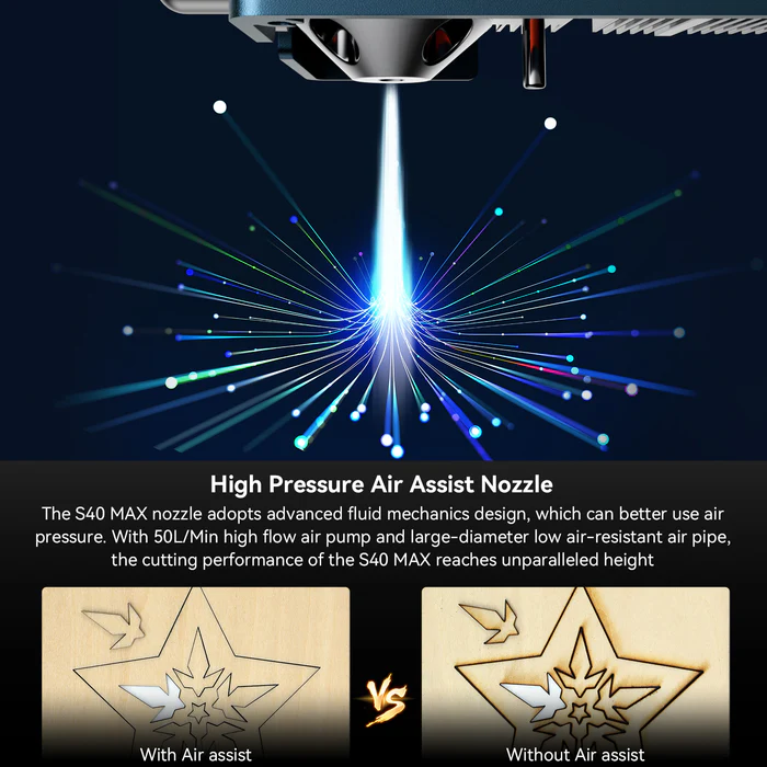 The S40 MAX is a professional laser engraving machine which utilizes twelve 6W semiconductor laser chips with a maximum chip laser power of up to 48W, empowering the machine with higher performance and delivering the exceptional efficiency. Full 100% power with the standard 50L high flow air pump, which can cut 20mm plywood and 6mm dark acrylic at one pass time.