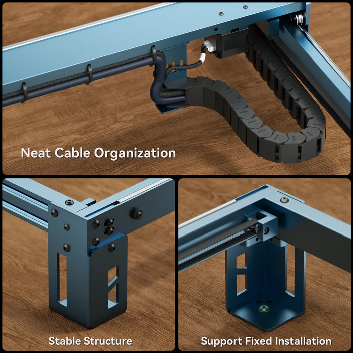 It is equipped with four support feet and fixed holes, using the new type of three-axis three-roller structure. This design enables high-speed and smooth operation as well as low noise during working, making it suitable for heavy-duty engraving and cutting tasks.