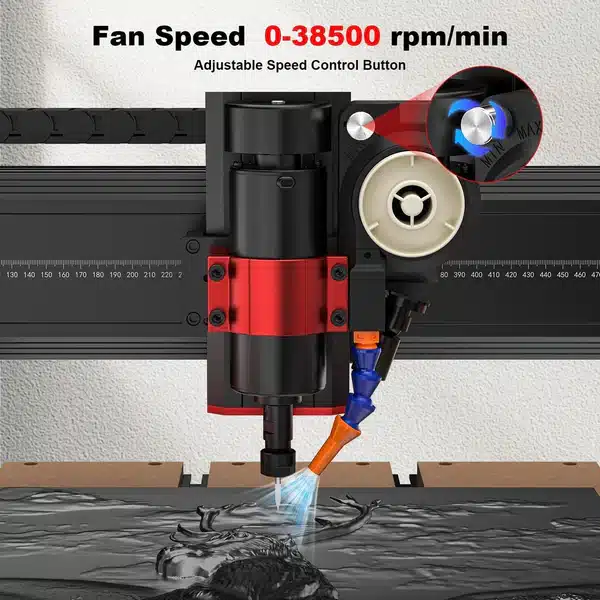 Equipped with a powerful 500W motor delivering adjustable airflow up to 38,500 RPM, this air-cooled kit effectively dissipates heat and removes debris from the cutting area in real time. During CNC machining—especially when engraving aluminum, copper, stainless steel, and acrylic—heat accumulation can cause tool sticking, edge burning, and surface roughness. The high-speed airflow minimizes friction, stabilizes spindle temperature, and ensures continuous chip evacuation. This results in smoother cutting paths, improved dimensional accuracy, and significantly reduced tool wear, making it ideal for long-duration engraving tasks.
