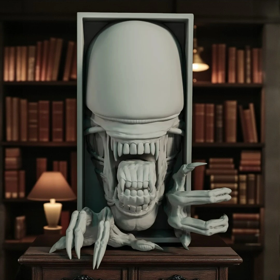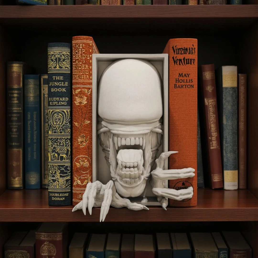 Add a spine-chilling twist to your bookshelf or wall display with this Xenomorph Book Nook and Wall Mount. Inspired by the iconic creature from the Alien franchise, this hyper-detailed 3D sculpture features the terrifying xenomorph bursting from between your books, complete with its inner jaws and clawed hands reaching outward. Whether you’re a sci-fi fan or horror enthusiast, this piece is sure to be a bold conversation starter. Designed to fit seamlessly between standard books or hang as an eerie wall accent, it blends cinematic art with dark, otherworldly flair.